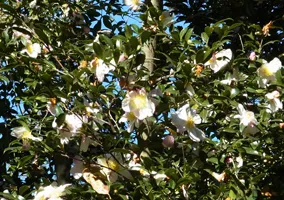 晩秋に口ずさむ童謡。歌詞には「北風」や「木枯らし」など、思わずたき火にあたりたくなるフレーズが出てくる。路上に落ち葉が増える時季の、風で転がる乾いた葉の音。煙の匂い。市街地では、落ち葉で焚き火のできる場所は限られているだろうな。この歌は東京で作られたということなので、サザンカは自然分布ではなく植栽だろうか。(2014.12.1)