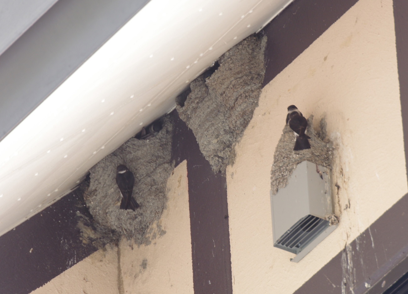 2025年7月27日 南信州のS峠。集合場所でイワツバメのコロニーを見る。今年生まれの個体が多数、電線や巣の近くに止まる。そして飛び立つを繰り返す。繁殖の後期によく見られる行動だ。 メボソ